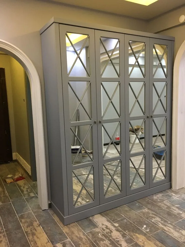 Combine painted surfaces, wood accents, and patterned panels. Add shelf lighting, drawer illumination, and adjustable hanging rails to adapt to your wardrobe. Coordinated colour schemes enhance the decorative fretwork effect.
